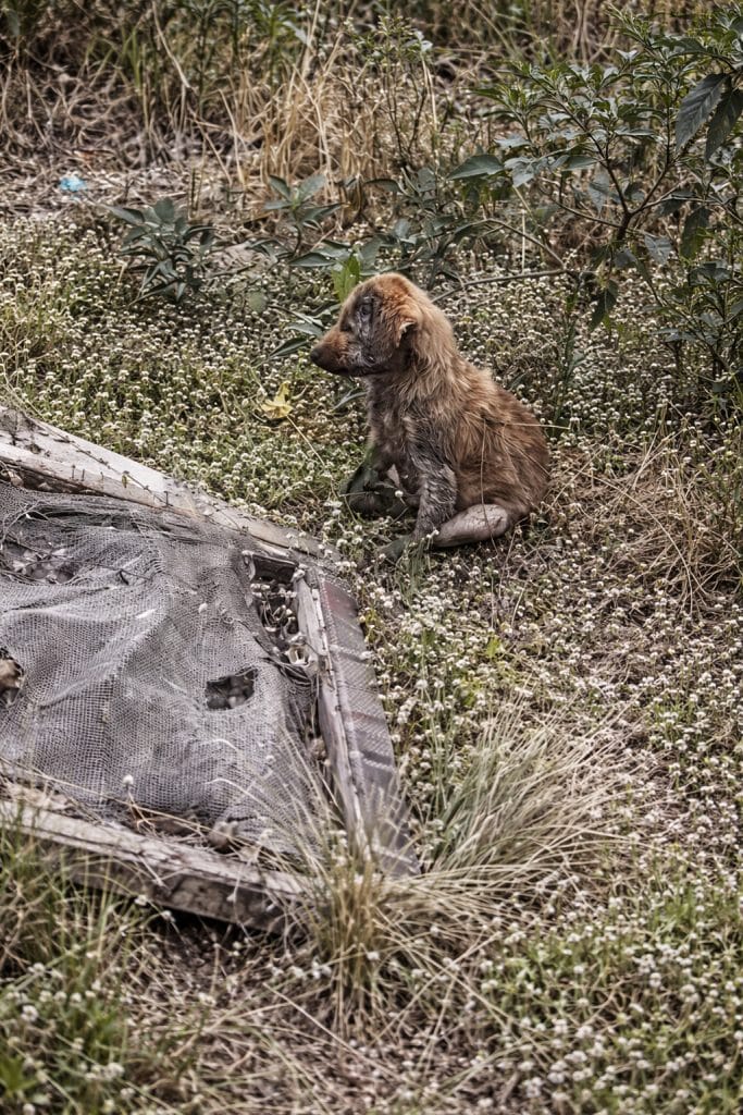 In a dry, overgrown area where few people would stop to look, a small dog lay hidden among the bushes.