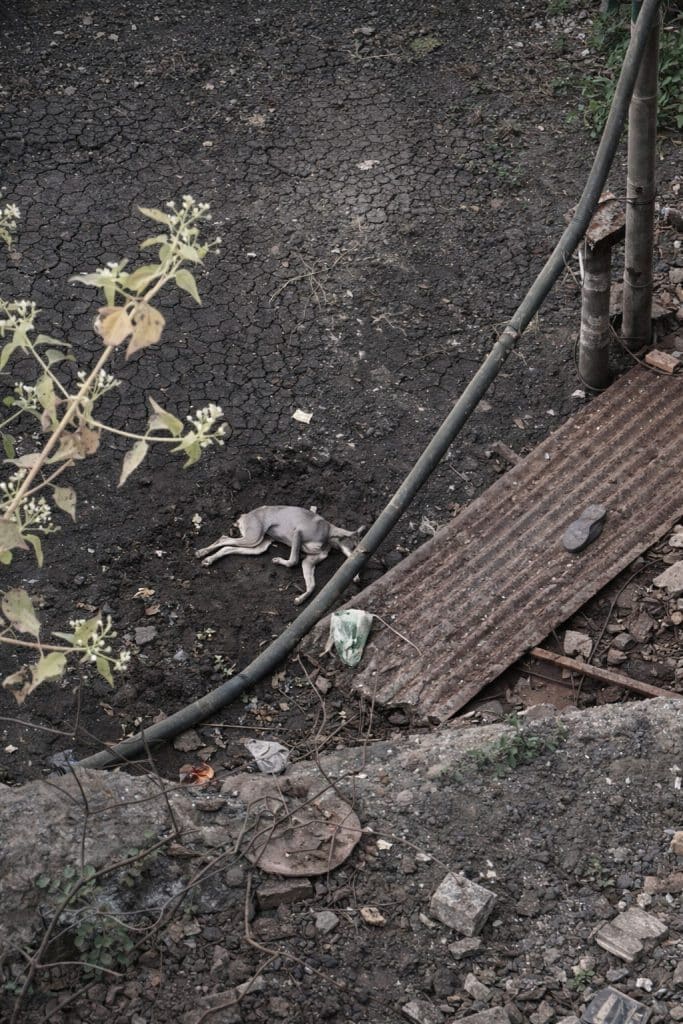 Far below, barely visible among the dirt and debris, lies a small gray dog. He is completely still.