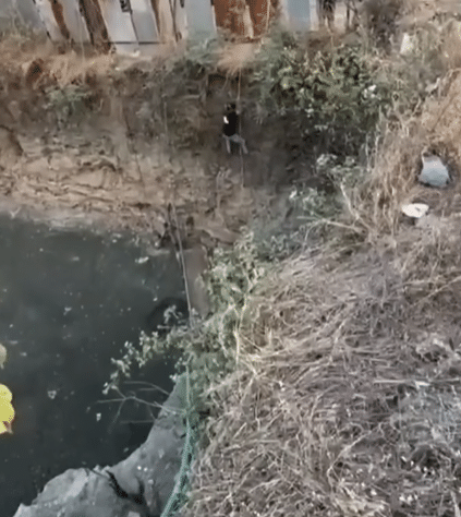 Using a long rope, he carefully lowered his body along the steep, slippery walls of the pit. Every step required balance and focus. The terrain was unstable, and one mistake could have been dangerous.
