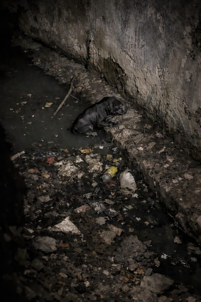 The space is dark, wet, and filled with trash. Dirty water flows around him, soaking his small body. He trembles quietly, too weak to struggle, as if he has already given up hope.