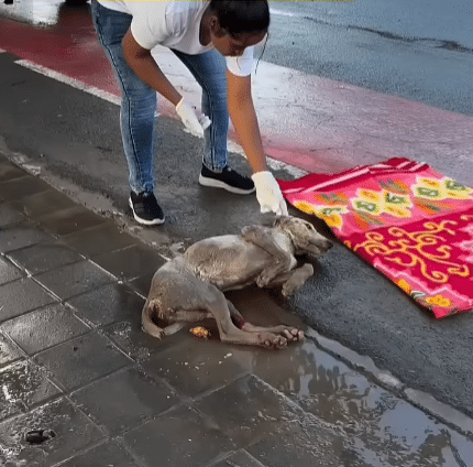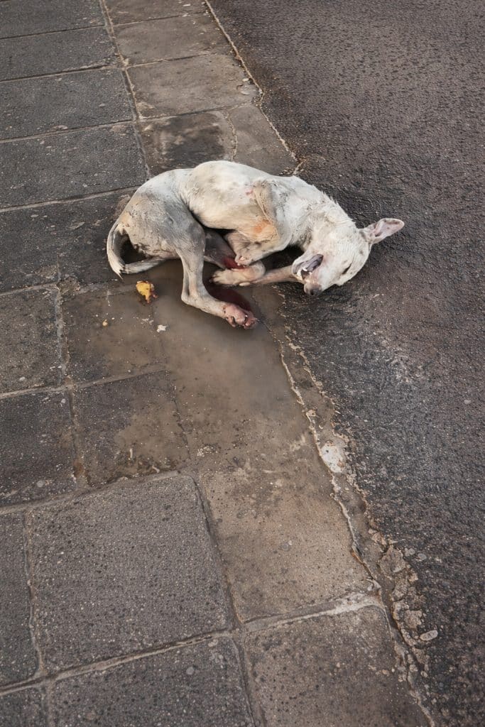 A white dog lies on the sidewalk, her body trembling as she lets out soft cries of pain. Her name is Dua.