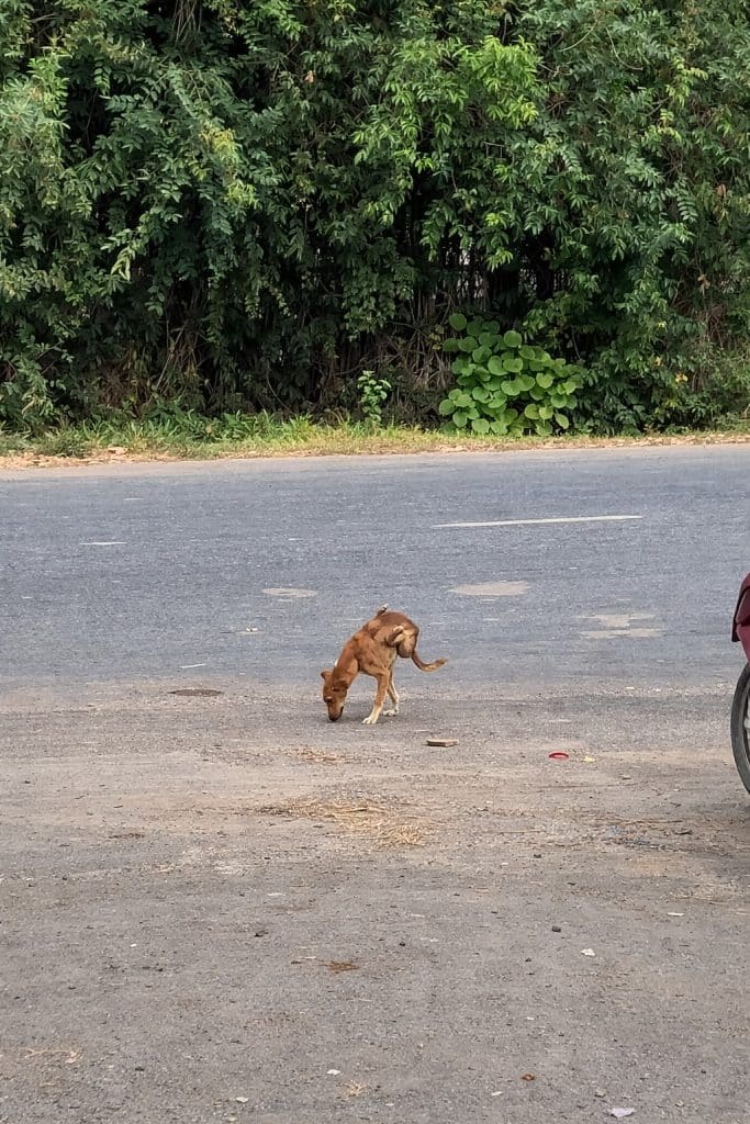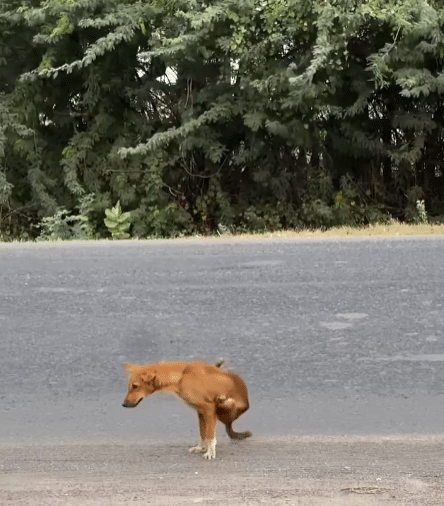 A thin brown dog slowly pulls himself along the roadside. His back legs no longer work, forcing him to rely entirely on his front legs to move forward.