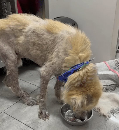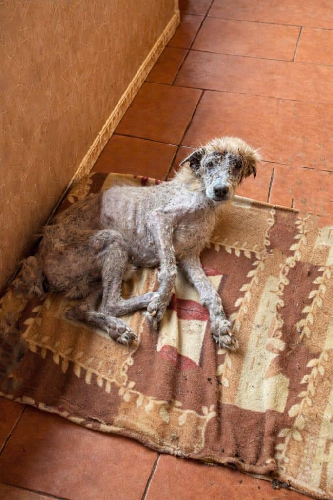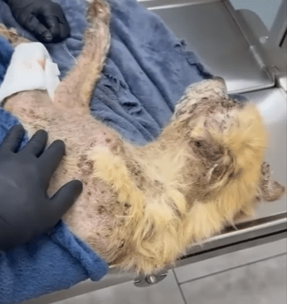 His body was weak and fragile. His skin showed signs of severe damage, affected by long-term conditions that had been left untreated. Patches of fur were missing, and his overall condition reflected both age and neglect.
