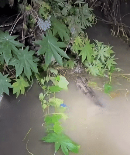 Amid the chaos, a small dog clings desperately to thin branches and patches of grass along the riverbank.