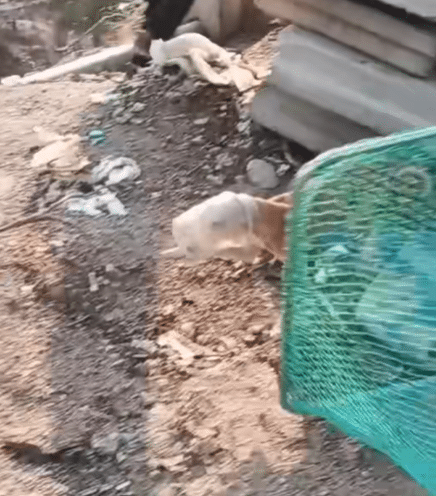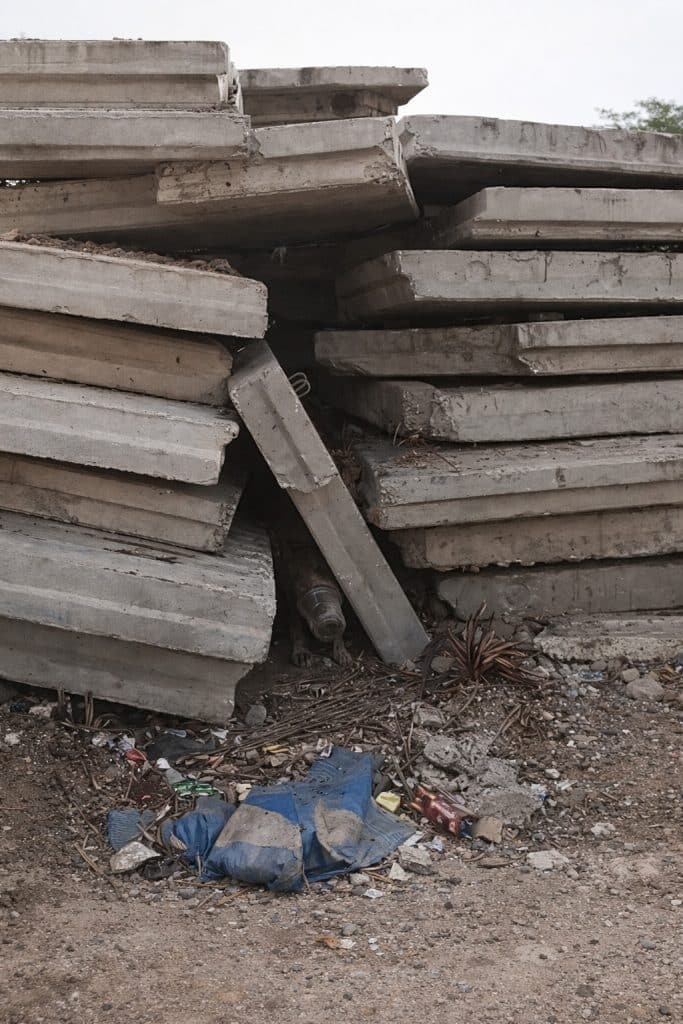 At the start of the video, a brown stray dog is seen hiding beneath stacked concrete slabs in what appears to be a construction site or empty lot.