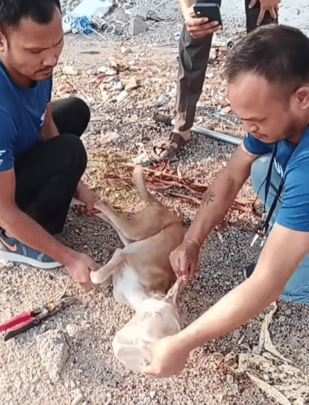 One rescuer gently guided the dog out from beneath the concrete slabs, while another quickly secured him with the net.