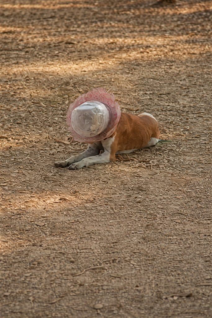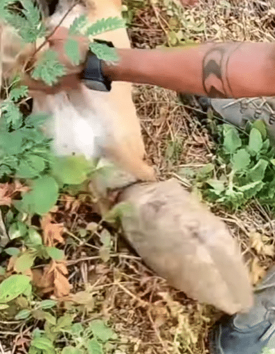 Hidden among thick bushes, a stray dog is found struggling—his head completely stuck inside a discarded plastic jar.