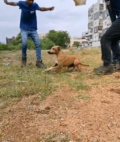 The dog, terrified and disoriented, tries to escape. He barks, twists, and pulls away, acting purely on fear.