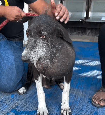 The black-and-white dog had a massive swelling beneath his jaw—so large that it changed the shape of his face and weighed heavily on his neck.