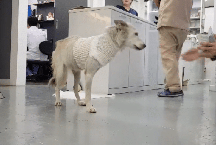 A small, white-and-gray dog… carrying something far too heavy for his fragile body.
