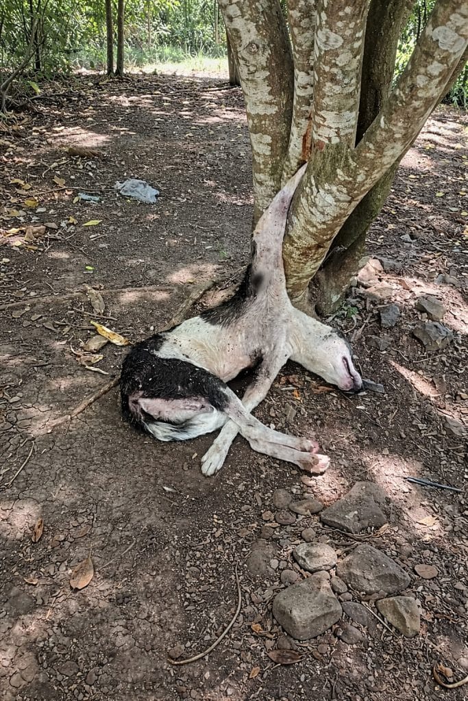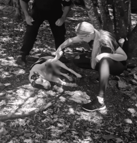 At the start of the video, Murta, an elderly dog, is found lying helpless beneath the roots of a tree. Her body is covered in wounds, and one of her front legs has been completely shattered.