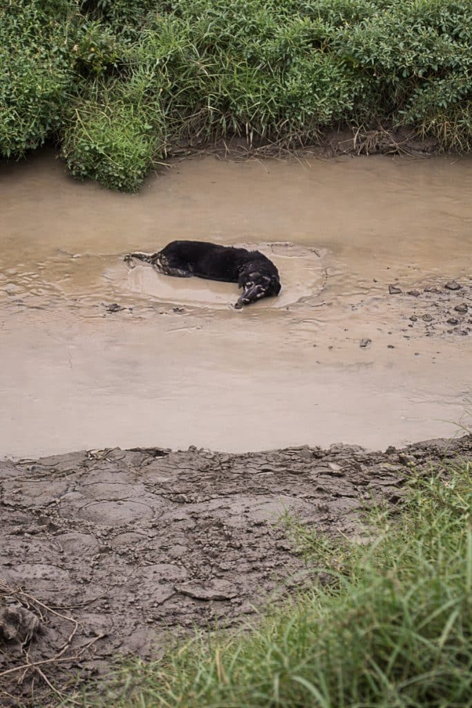 After a series of heavy downpours, a small black dog had become trapped in a thick mud pit near a cornfield. Half of his body was submerged, his legs sinking into the sticky muck with every movement.