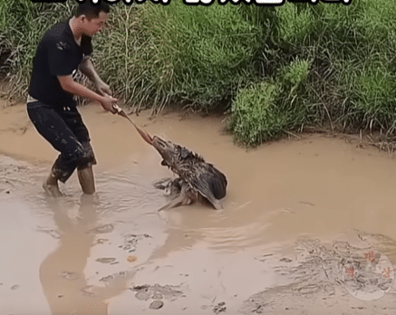 A truck driver happened to pass by this familiar road and noticed the desperate scene. Without hesitation, he waded into the mud, determined to help.