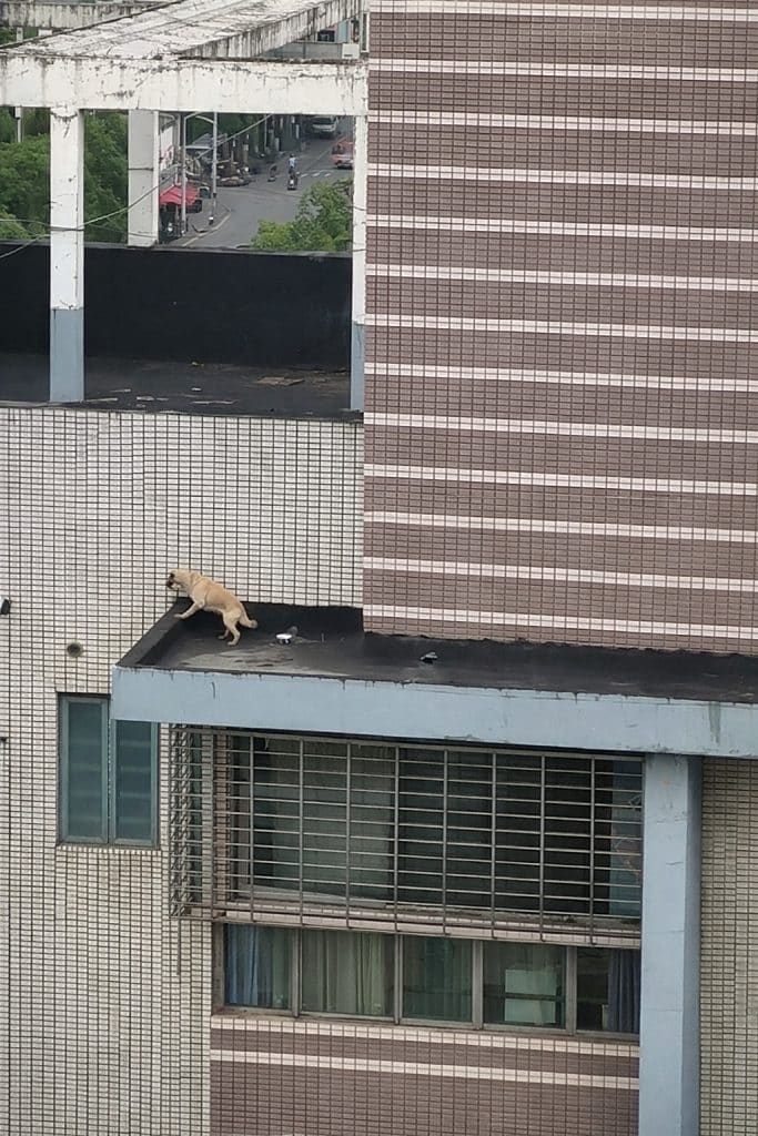 The video opens with a small yellow dog wandering nervously along a narrow wall and rooftop of a tall building. His tiny body trembles with fear and uncertainty as he peers over the edge, searching desperately for a way down.