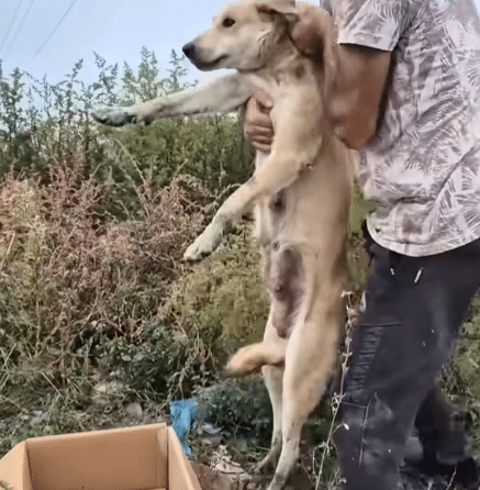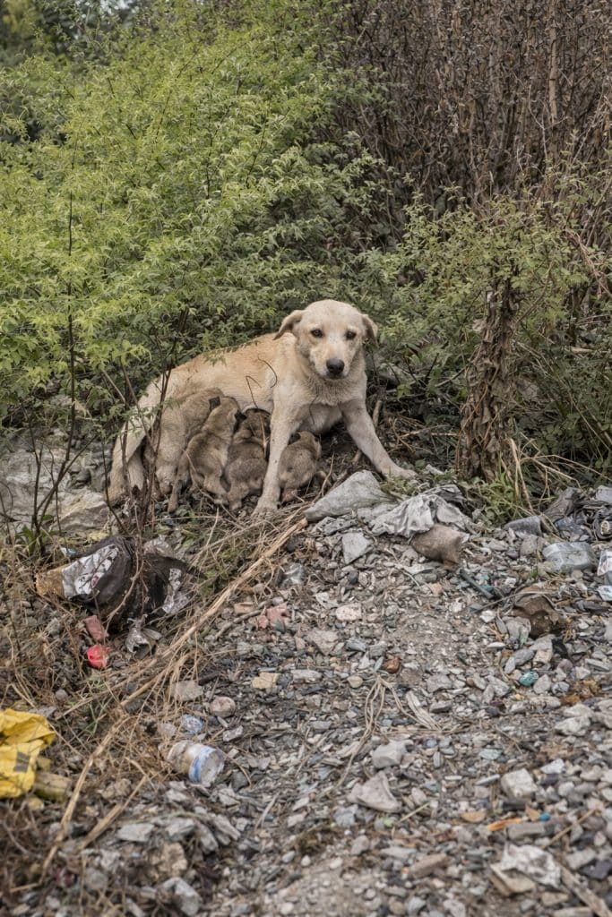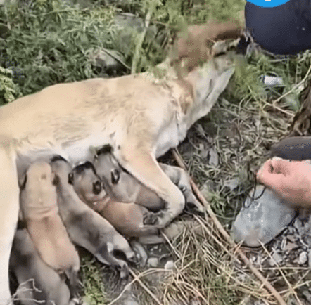 Around her, piles of waste and tangled bushes formed the only shelter she could find. And beside her—huddled close—were her tiny puppies, still too young to understand the world they had been born into.