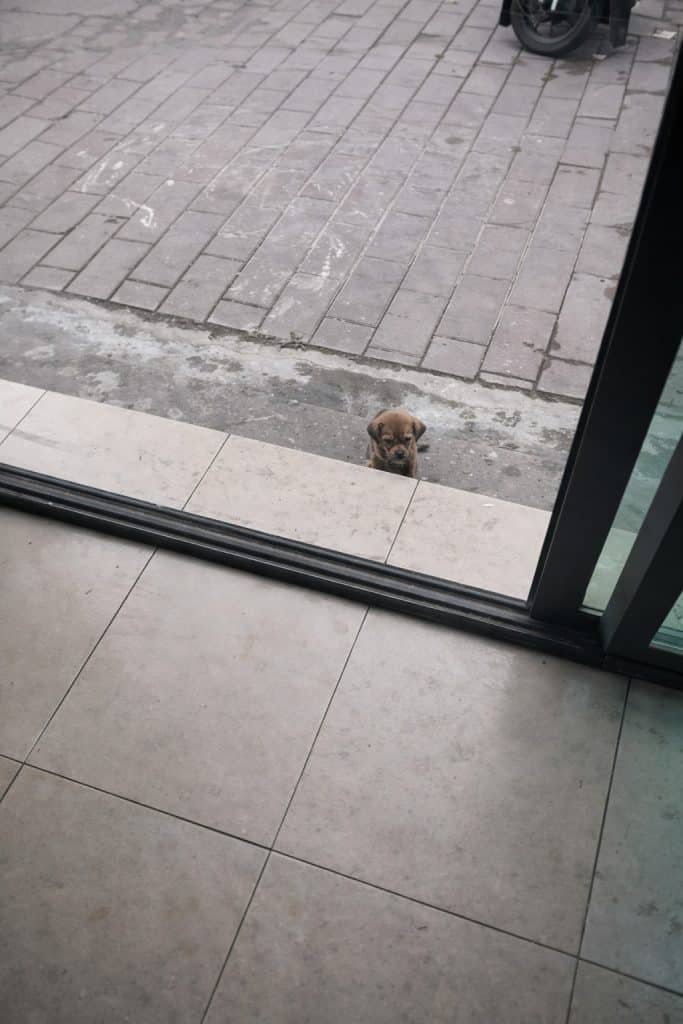 A small figure appeared at the entrance of a modest restaurant—thin, trembling, and unsure of where to go next. He didn’t bark. He didn’t approach too close.