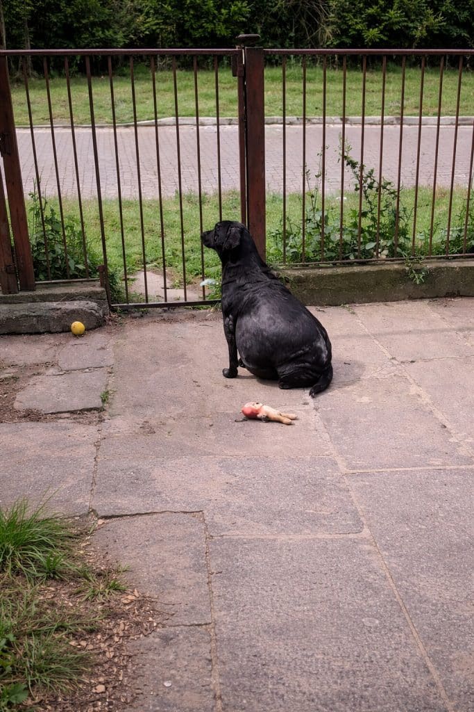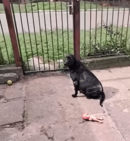 A black-coated mother dog had been left behind in an abandoned house—surrounded by debris, broken objects, and silence. The gate had been closed behind her.