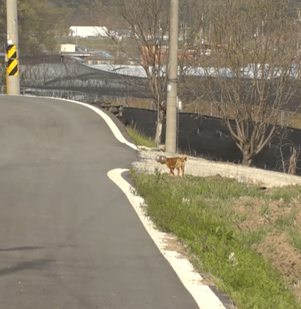 Along a quiet stretch of road, a small brown dog wandered alone.