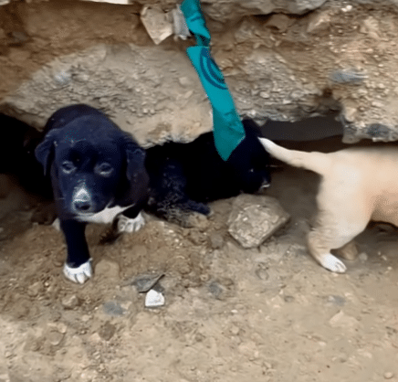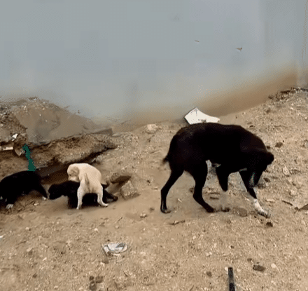 A black mother dog curled her body tightly around her puppies—some black, some white—doing everything she could to shield them from the cold.