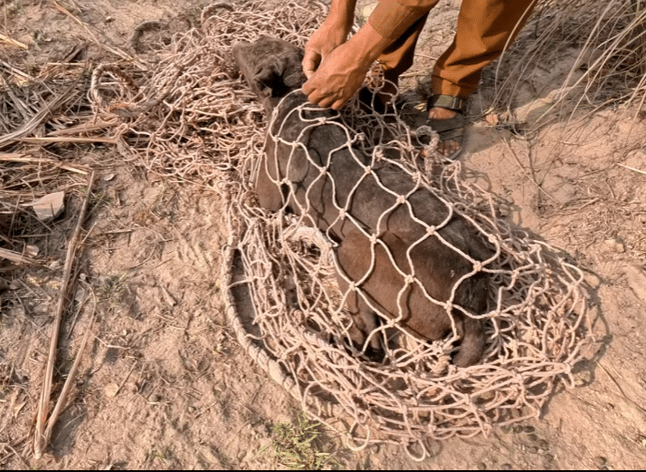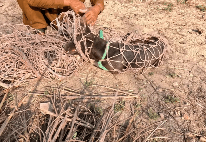 The man worked with his hands, gently pulling apart each section of rope. He started near the dog’s head, carefully freeing the areas that made breathing harder.