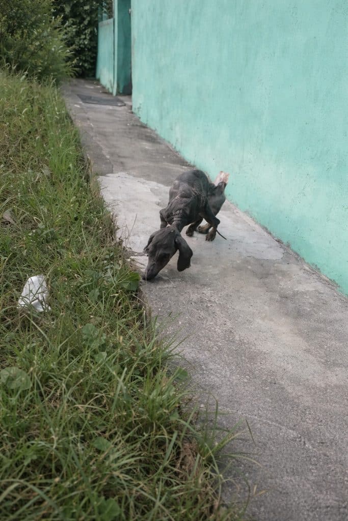 His skin was inflamed and rough, patches of fur almost completely gone. A strong odor lingered around him, a sign of how long he had been suffering. Each step seemed uncomfortable, his legs stiff and sore.