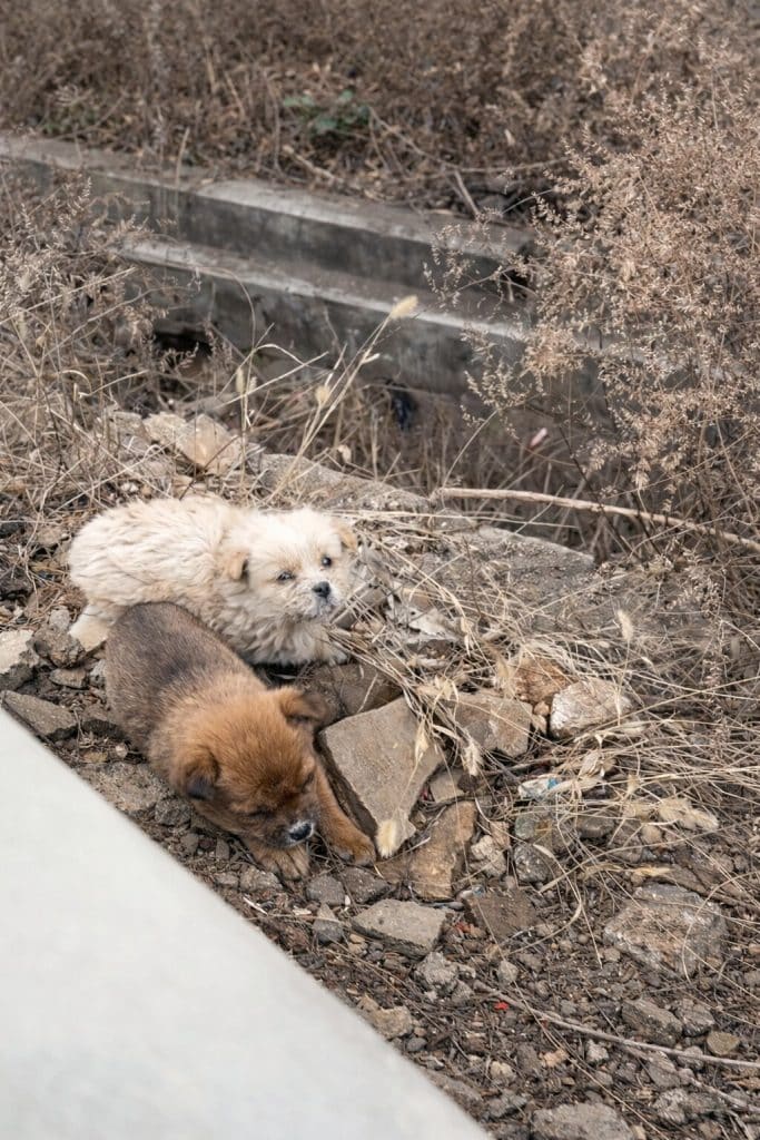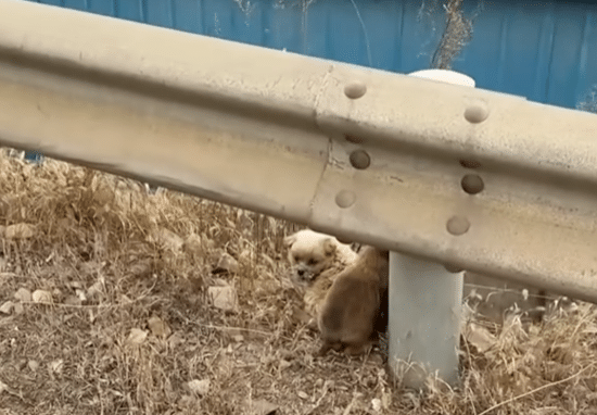 Near a stone post by the roadside, two tiny puppies huddled close together—