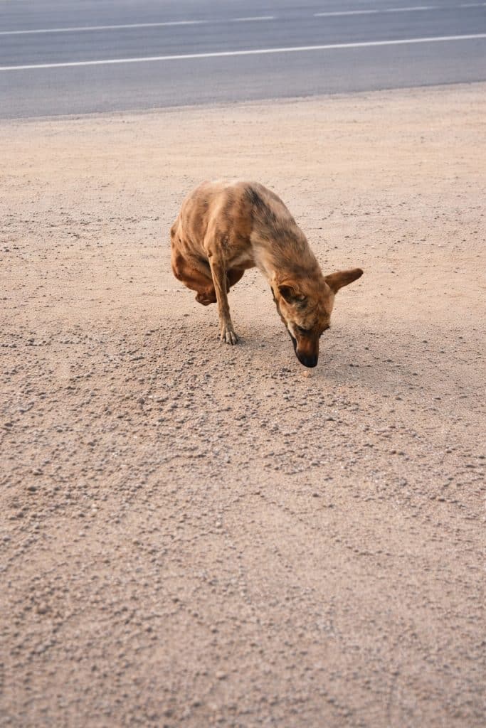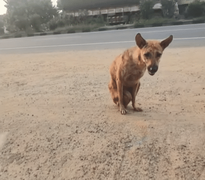 A thin, injured dog was dragging herself across the ground, her body covered in dirt and wounds, resting beside a patch of muddy water.