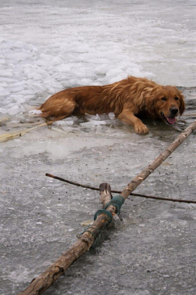 Instead of stepping onto the frozen surface, they reached for long tree branches and extended them toward him from a distance.
