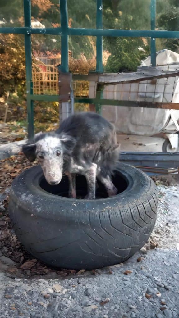 She curled herself into the hollow of an abandoned car tire, pressing her fragile body against cold rubber in a desperate attempt to survive the freezing air. The tire sat on the edge of a quiet street, unnoticed by most, discarded like the life hiding inside it. Her skin was ravaged by mange, sore and inflamed, her fur nearly gone. Every shiver rattled through her small frame. She had no collar, no name, and no place that felt safe.