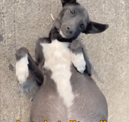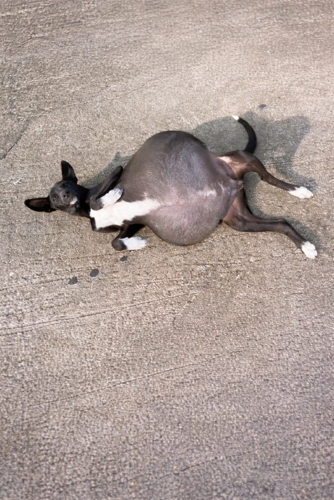 A black-and-white dog with a swollen belly so large, it didn’t look natural.
