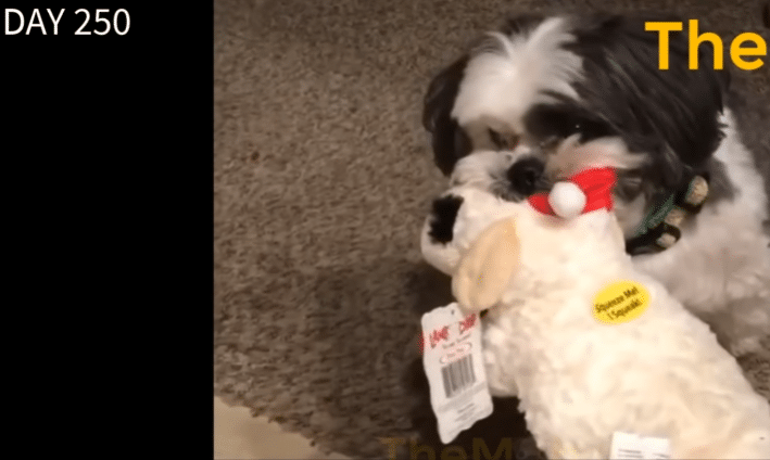 He runs across grass. Plays with other animals. Carries toys in his mouth like any happy dog would.