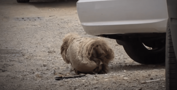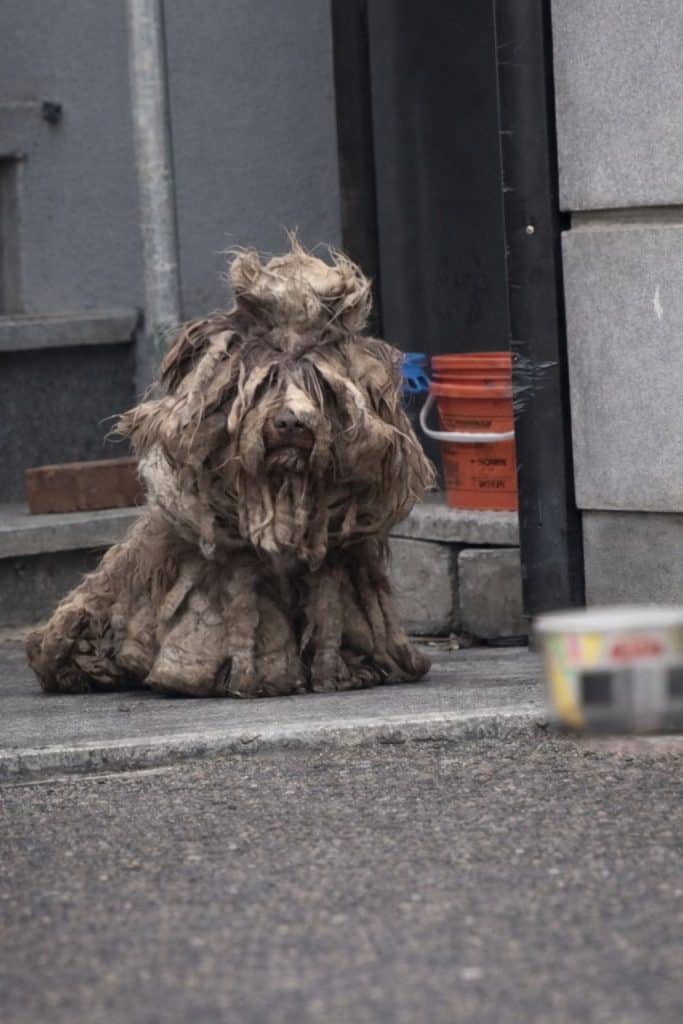 A small dog stood unsteadily on the street, his body covered in thick, tangled fur that clung to him like heavy layers.