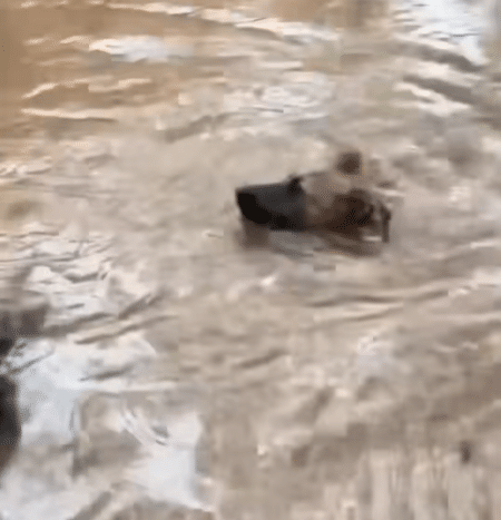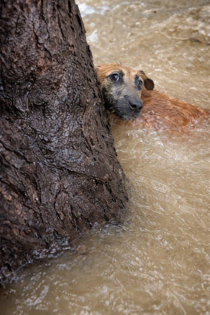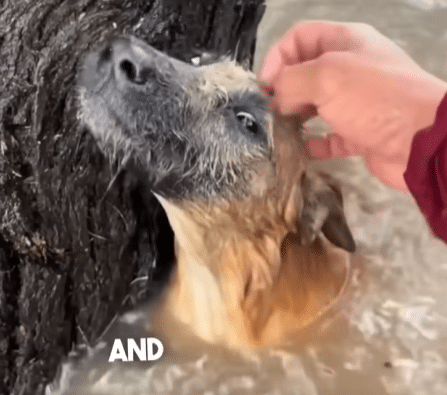 Clinging tightly to the base of a tree, surrounded by rushing water. His body trembled as he struggled to keep his head above the surface, his strength slowly fading with every passing second.