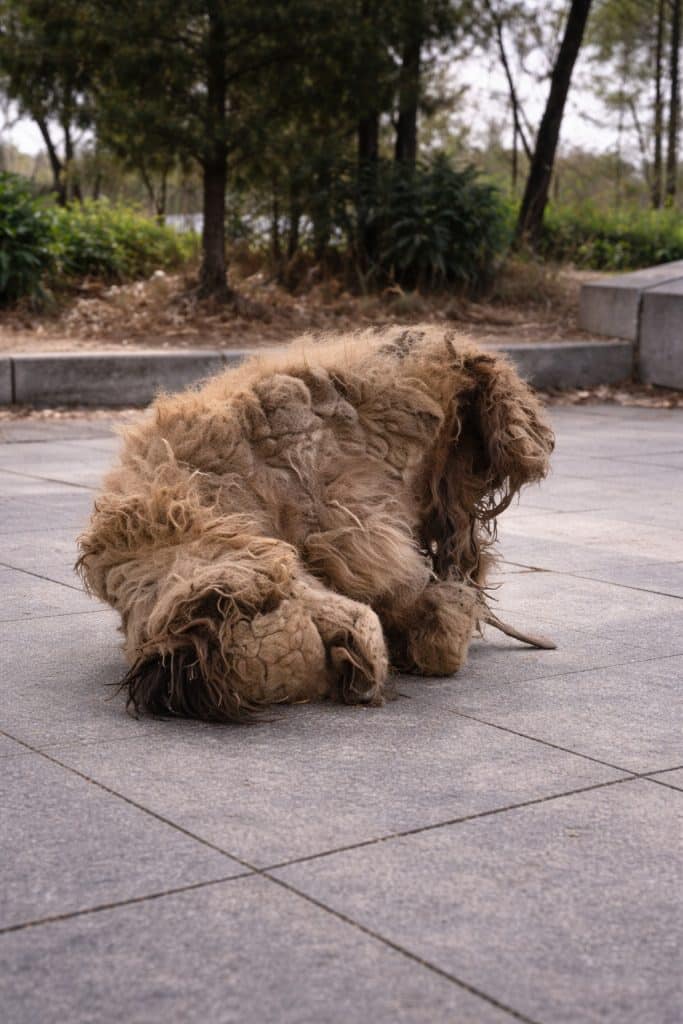 A small dog, almost completely covered by layers of thick, hardened fur that had gone untouched for far too long.