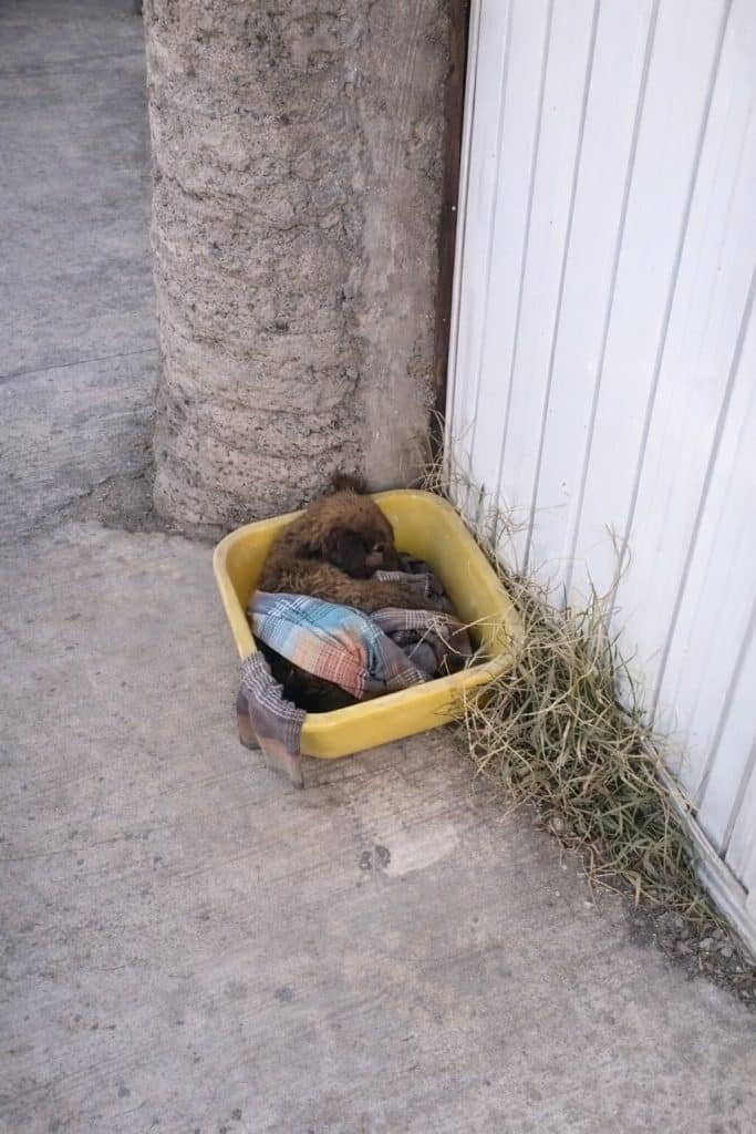 He placed the puppy down, wrapped in a cloth, set inside a plastic tray… and walked away.