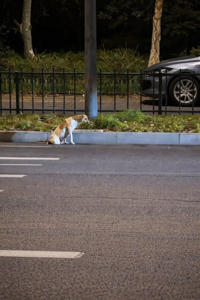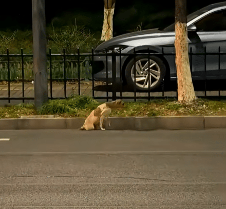 At the edge of a busy road, a small dog moved slowly.