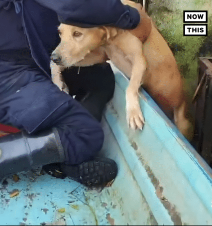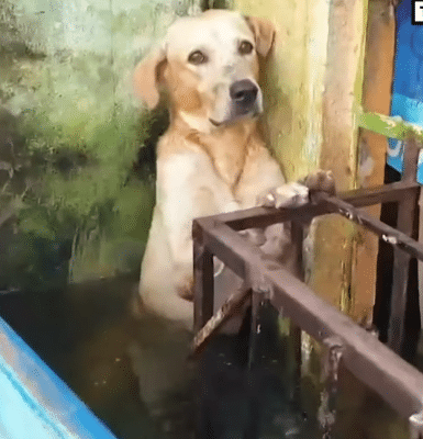 Instead, she stood upright on her back legs, pressing her front paws tightly against a metal gate—just high enough to keep her head above the water.