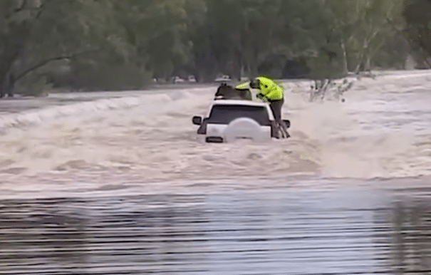 In the middle of it all, a white SUV sat half-submerged—