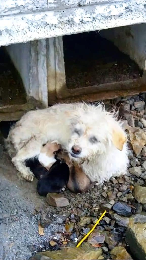 Molly was found in a forgotten corner of the community, far from comfort or protection. Her body was exhausted, her strength nearly gone, yet she was curled tightly around her newborn puppies. She had clearly been struggling for a long time, but her focus never wavered. Every remaining ounce of energy she had was spent keeping her babies warm and close. To anyone who witnessed the scene, it was clear that Molly had reached her limit—but she refused to let go until her puppies were safe.
