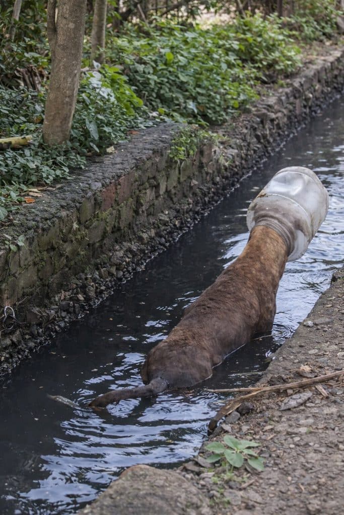 Through puddles and drainage paths.