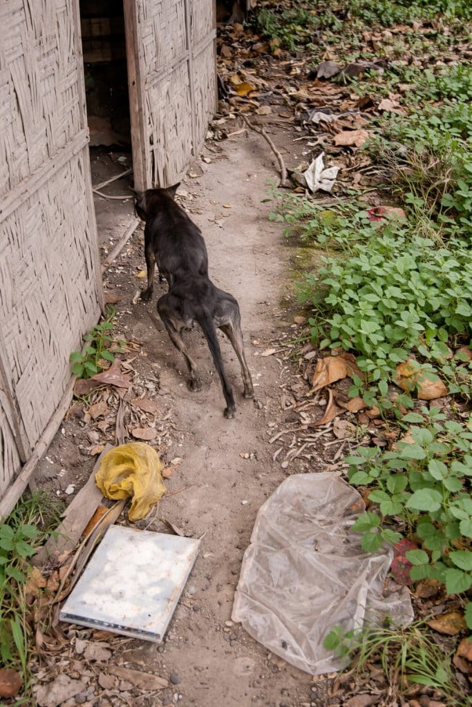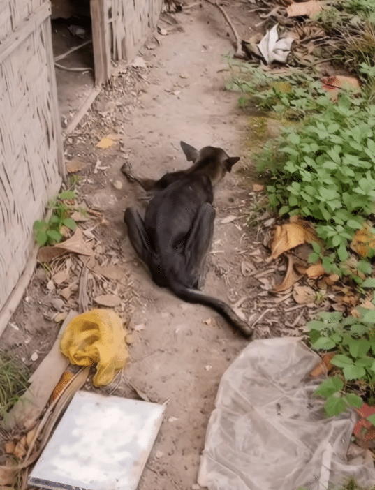 A thin, fragile dog lay close to the ground, his body showing signs of long exhaustion.