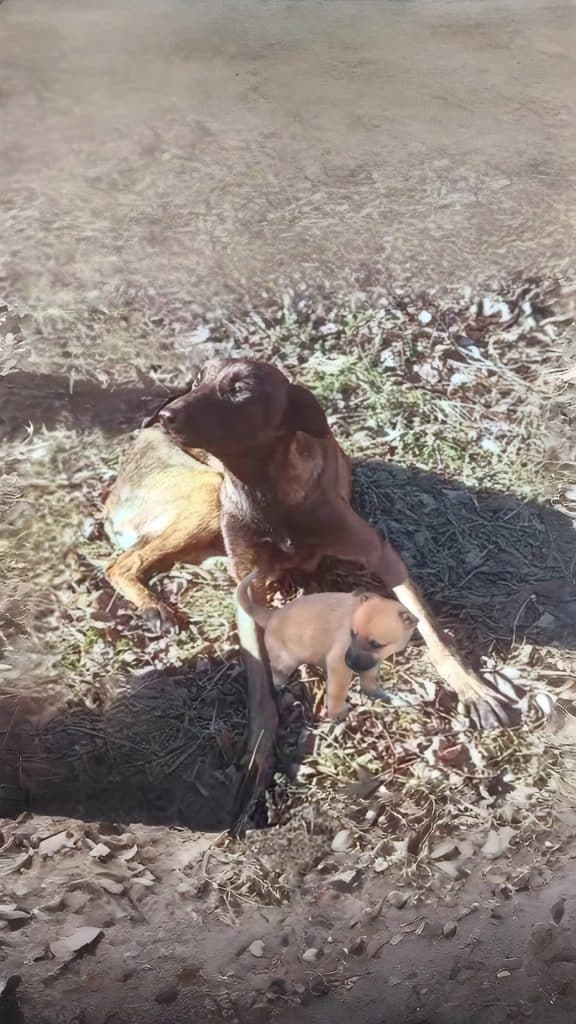 As soon as the puppy was brought to her, the mother’s reaction was immediate. She leaned forward, sniffing gently, her body relaxing for the first time. Recognition washed over her. Relief followed. But the rescuers sensed this wasn’t the end of the search. One puppy alone rarely tells the whole story.