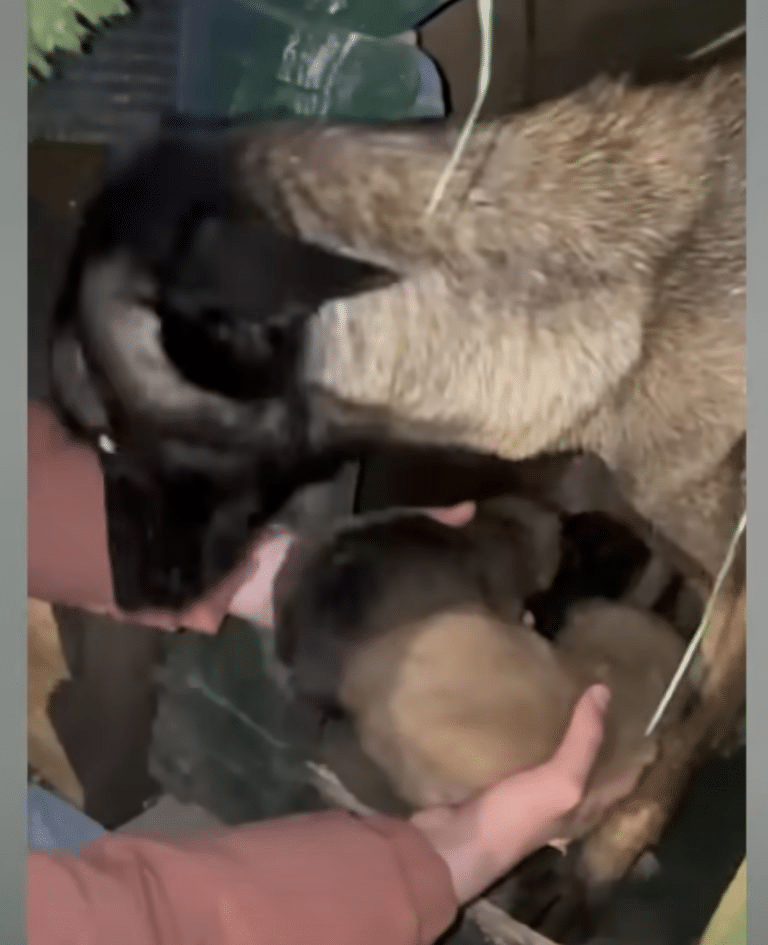They decided to trust the mother’s instincts. Once she regained enough strength to walk, they allowed her to lead. Without hesitation, she guided them toward an old, broken doghouse near the edge of the property. Her pace quickened. Her tail lifted and wagged, as if hope itself was pulling her forward.