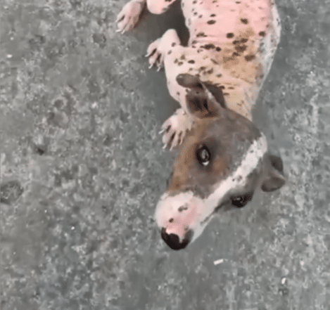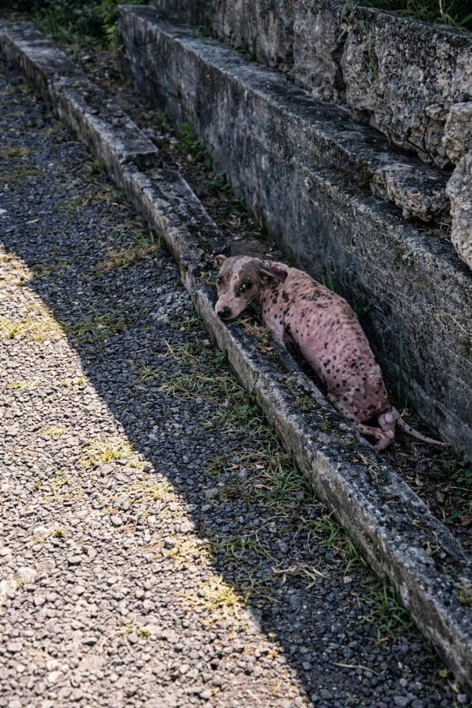 His skin showed signs of long exposure, irritated and sensitive, with patches of fur missing.