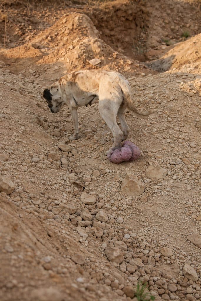 A large mass hung from her hind leg—so heavy that each step became a challenge.
