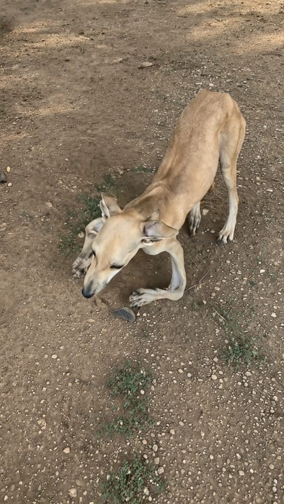 Not with the light, effortless steps you would expect from a slender dog like him—but with difficulty, strain, and visible discomfort.