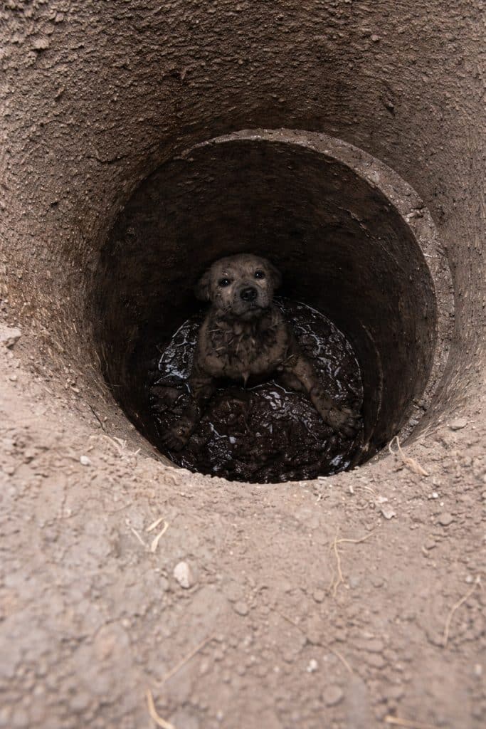 Below, the dog stayed still, holding tight as he was lifted upward—away from the cold, away from the darkness.