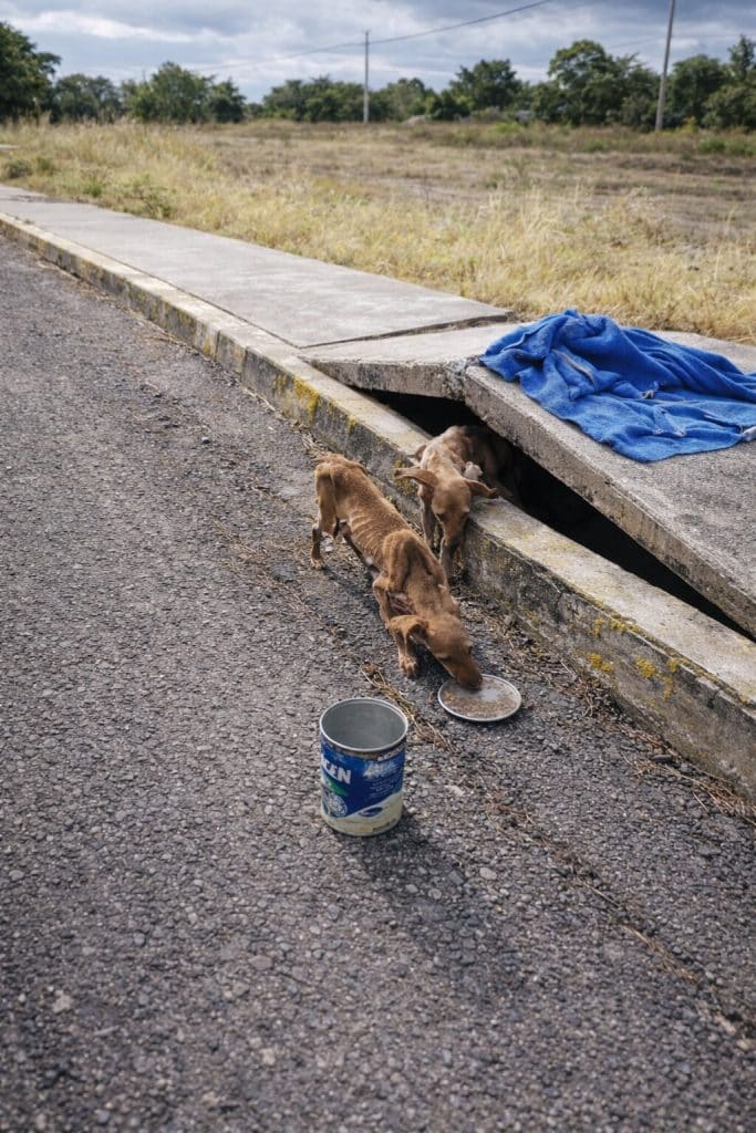 In the middle of a busy road, where cars rushed past without pause, two small shapes stayed hidden.