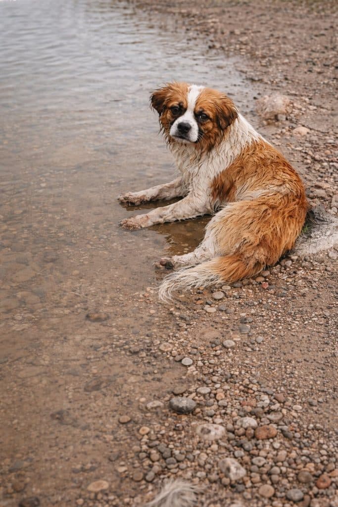 By the edge of the water, where the current moved quietly past, a small dog lay still.