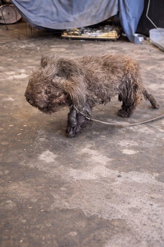 Her fur had grown into thick, tangled mats—heavy, dirty, and covering much of her small body, even her face.